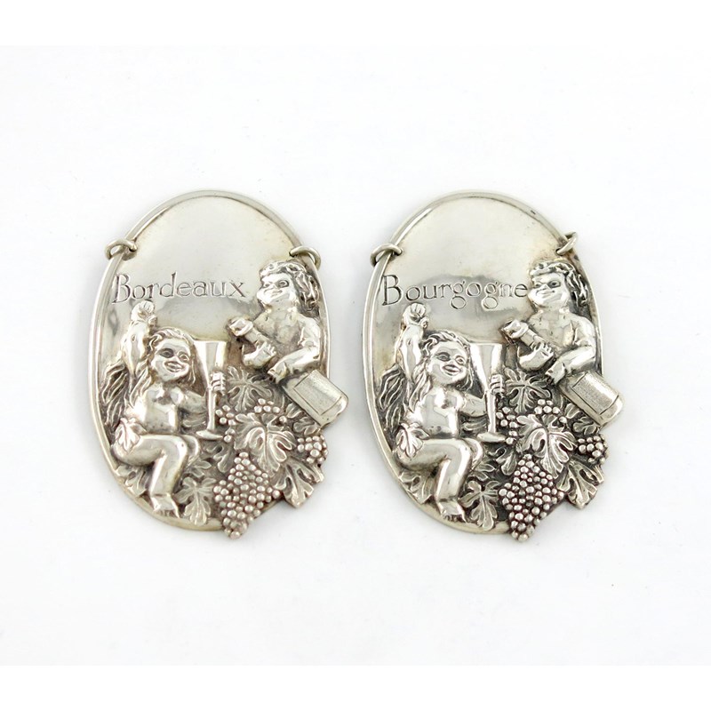 embossed with putti holding a bottle and goblet, with vine decoration, incised 'BORDEAUX' and 'BOURGOGNE', length 6.5cm, approx. weight 1.6oz. (2)