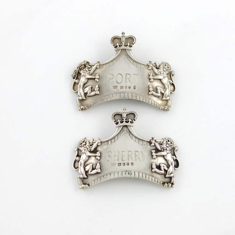 shaped form, with a crown finial, and mounted with two standing lions, incised 'PORT' and 'SHERRY', length 6.3cm, approx. weight 1.9oz. (2)