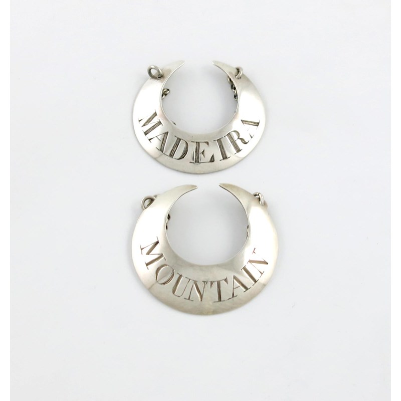 crescent form, incised 'MOUNTAIN', length 4.8cm, plus a George III silver wine label, by Sandilands Drinkwater, crescent form, incised 'MADEIRA', approx. weight 0.7oz. (2)