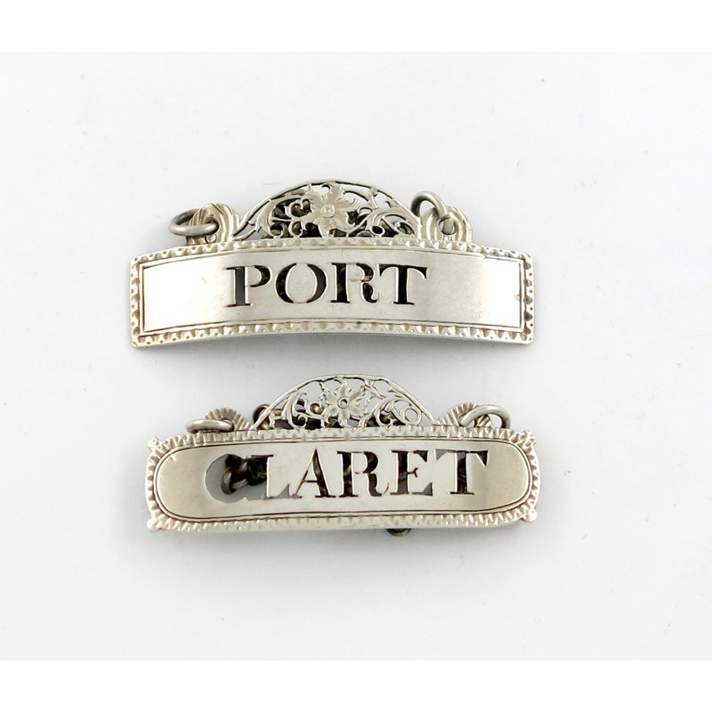 rectangular form, pierced arched pediment, bright cut border, pierced 'PORT', plus a similar label, pierced 'CLARET', some damage, approx. weight 0.5oz. (2)