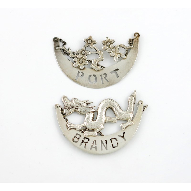 crescent form, mounted with a pierced dragon and blossom, pierced 'PORT' and 'BRANDY', length 6cm, approx. weight 0.5oz. (2)