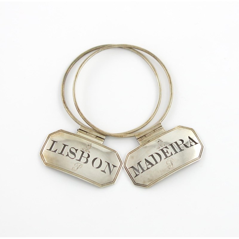 rectangular form, canted corners, reeded borders, hinged neck rings, engraved with a crest and initialled, pierced 'LISBON' and 'MADEIRA', length 4.8cm, approx. weight 1.1oz. (2)