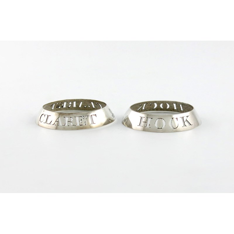 tapering form, crested, pierced 'CLARET' and 'HOCK', approx. weight 0.9oz. (2)