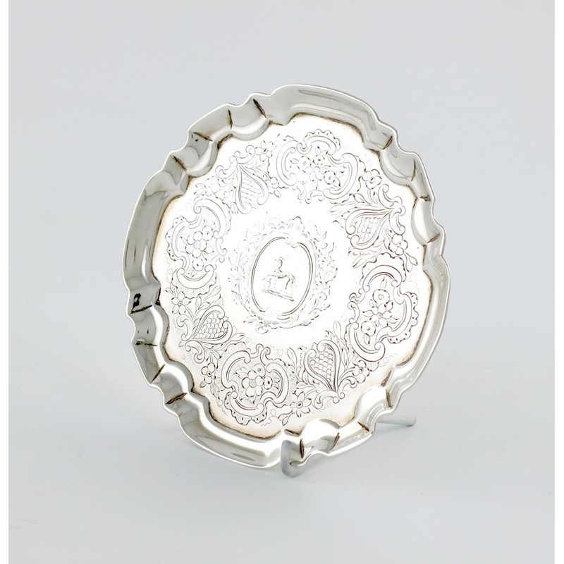 circular form, moulded border, chased decoration, engraved with a crest, on three bracket feet, diameter 15cm, approx. weight 5.5oz.