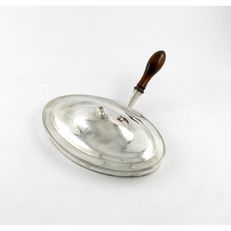 oval form, the domed cover with an urn finial and with a patch and later crest, wooden baluster handle, length 26.5cm, approx. weight 26.5oz.