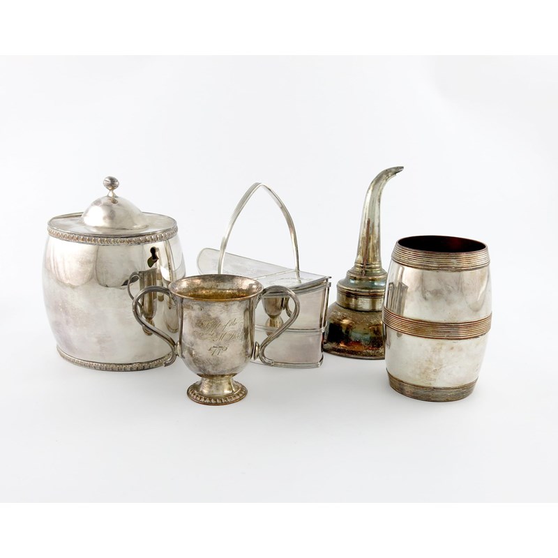 comprising: a double sugar box, of oval navette form, reeded borders and swing-handle, with two hinged covers, engraved with a crest, plus a tea caddy, a wine funnel, a barrel beaker and a small two-handled cup. (5)