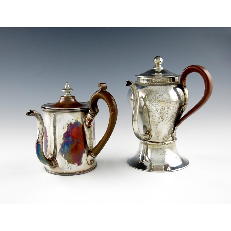 waisted baluster form, leather clad scroll handle, hinged cover with a ball finial, on a spread circular base, plus another old Sheffield plated argyle, of cylindrical form, scroll handle, urn finial. (2)