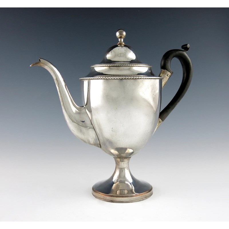urn form, scroll handle, bright-cut decoration, with two shield cartouches, hinged cover with a ball finial, gadroon border, on a circular foot, height 27cm.