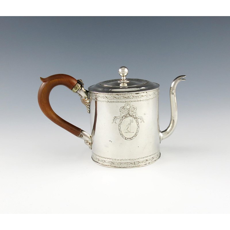 circular drum form, scroll handle, chased decoration, with an oval cartouche, pull-off cover with a ball finial, the water compartment with a hinged cover, with a crest, height 11.3cm.