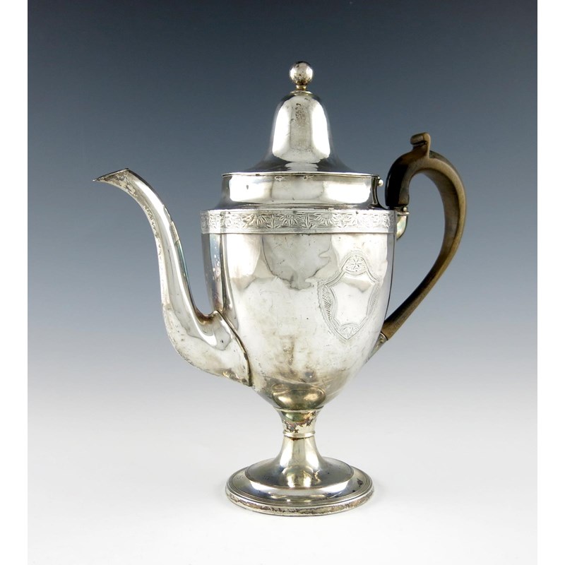 urn form, scroll handle, bright-cut decoration, with two shield cartouches, hinged cover with a ball finial, the water compartment, on a circular foot, height 27.3cm.