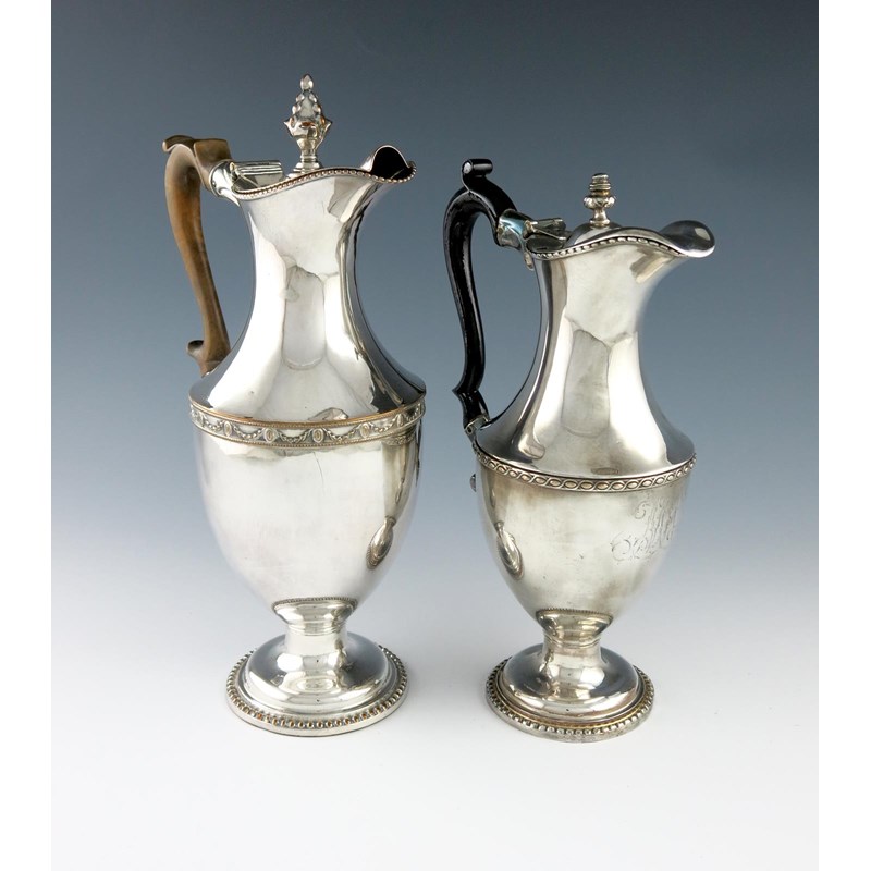 vase form, garland and swag girdle, scroll handle, the hinged cover with a stylised cone finial, on a raised circular foot with beaded borders, height 30cm, plus another George III old Sheffield plated ewer of similar form, engraved with a monogram. (2)