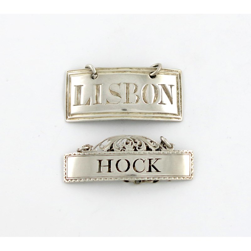rectangular form, incised 'LISBON; length 4.2cm, plus a George III silver wine label, of rectangular form, arched pediment, bright-cut border, incised 'HOCK', length 4.5cm, approx. weight 0.5oz. (2)