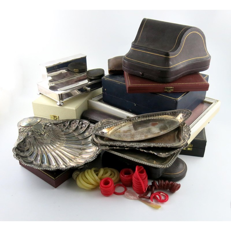 comprising: an old Sheffield plated inkstand, of rectangular form, with three hinged covers, and a pull-out drawer, plus a shell dish, three snuffers' trays, wax cords for wax jacks, various empty cases and other items. (qty)