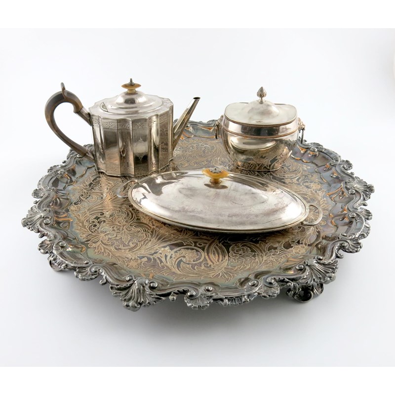 comprising: a large salver, circa 1830, circular form, foliate, shell and scroll border, the centre with chased decoration, engraved with an armorial, plus a George III teapot, a tea caddy and an oval cheese dish and cover. (4)