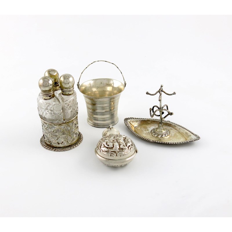 comprising: three scent bottles in a circular stand, Birmingham 1904, a cream pail, London 1900, a smelling salts bottle in a silver case, and a ring tree, approx. weighable 6.8oz. (4)
