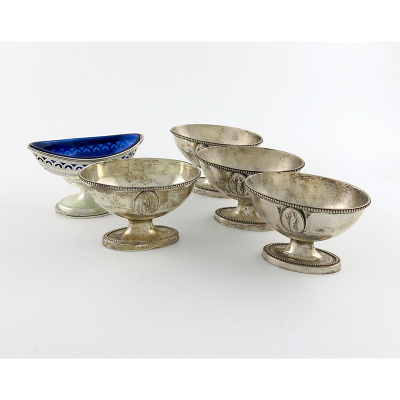 oval form, the front and back applied with a medallion of a classical maiden, beaded borders, on raised oval bases, length 9.8cm, plus a single George III salt cellar, by Langlands and Robertson, Newcastle, approx. weight 15.5oz. (5)