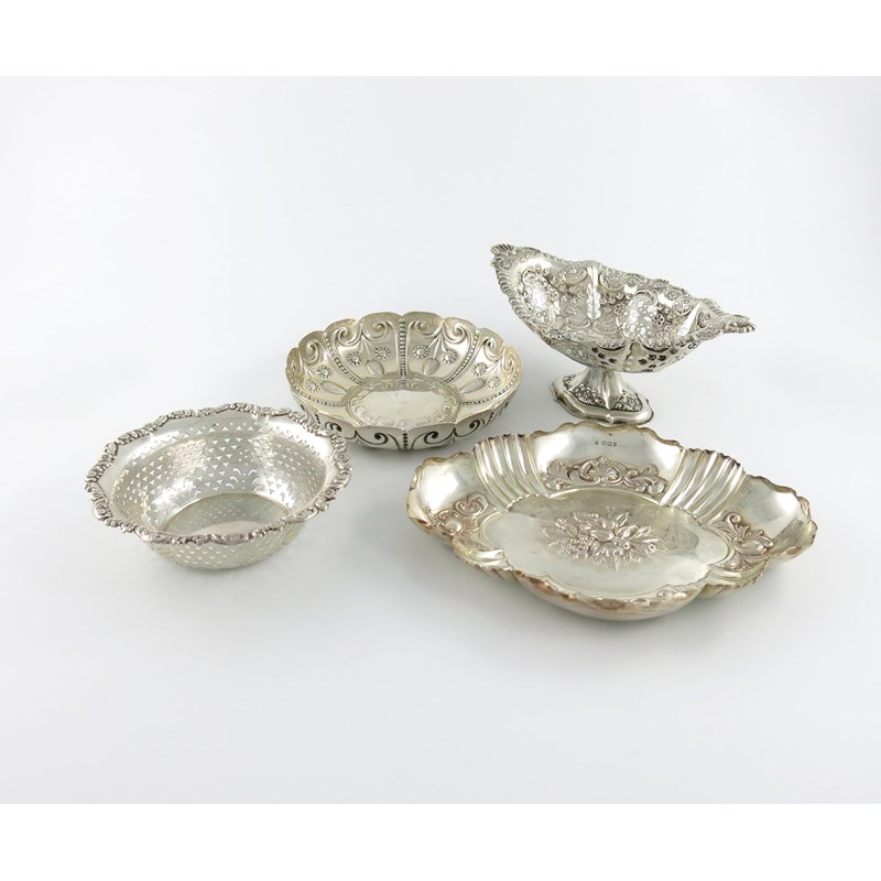 comprising: a circular dish, London 1898, a pierced oval dish on a shaped oval base, another shaped oval dish and a pierced circular basket, approx. weight 22.5oz. (4)