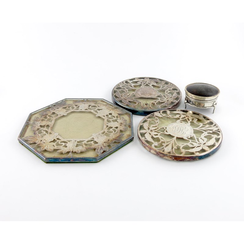 comprising: a silver and tortoiseshell trinket box, of circular form, Birmingham 1918, plus three silver and glass overlay teapot stands. (4)