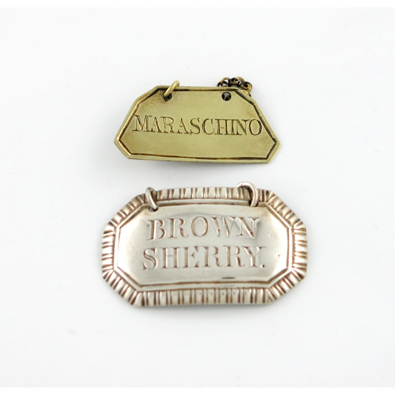 rectangular form, canted corners, gadroon border, incised 'BROWN SHERRY', length 4.2cm, plus a Victorian silver-gilt wine label, by the same maker, London 1849, incised 'MARASCHINO', approx. weight 0.5oz. (2)