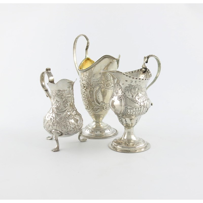 comprising: one by Stephen Adams, London 1783, helmet form, later embossed decoration, one of baluster form, London 1784, and another, London 1770, decorated with foliate scroll decoration, approx. weight 9oz. (3)