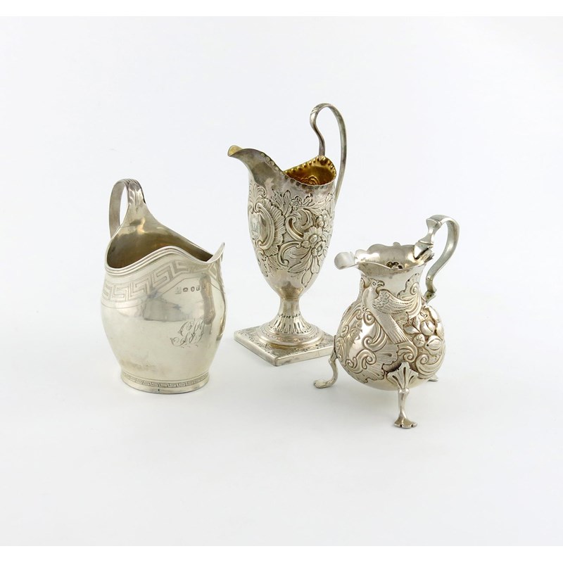 comprising: one by Peter and William Bateman, London 1806, oval form, Greek Key border, plus one of helmet form, London 1785, later decoration, and one of baluster form, London 1747, decorated with birds and scroll decoration, approx. weight 9.5oz. (3)