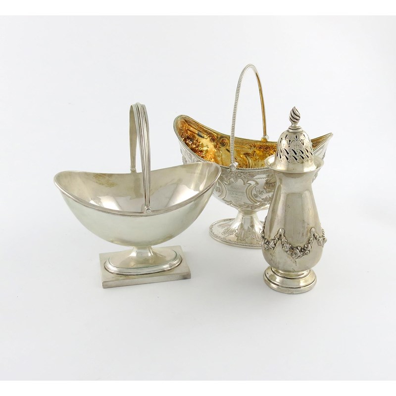comprising: a Victorian swing-handled basket, London 1882, another swing-handled basket, and a sugar caster, of baluster form, with a garland of flowers, approx. weight 18oz. (3)