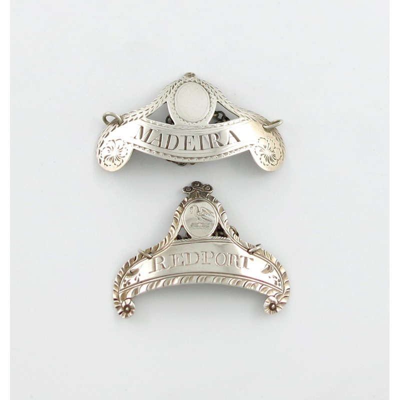 scroll banner form, bright-cut border, incised 'MADEIRA', plus a similar George III silver wine label, unmarked, feather-edge border, incised 'RED PORT', approx. weight 0.5oz. (2)