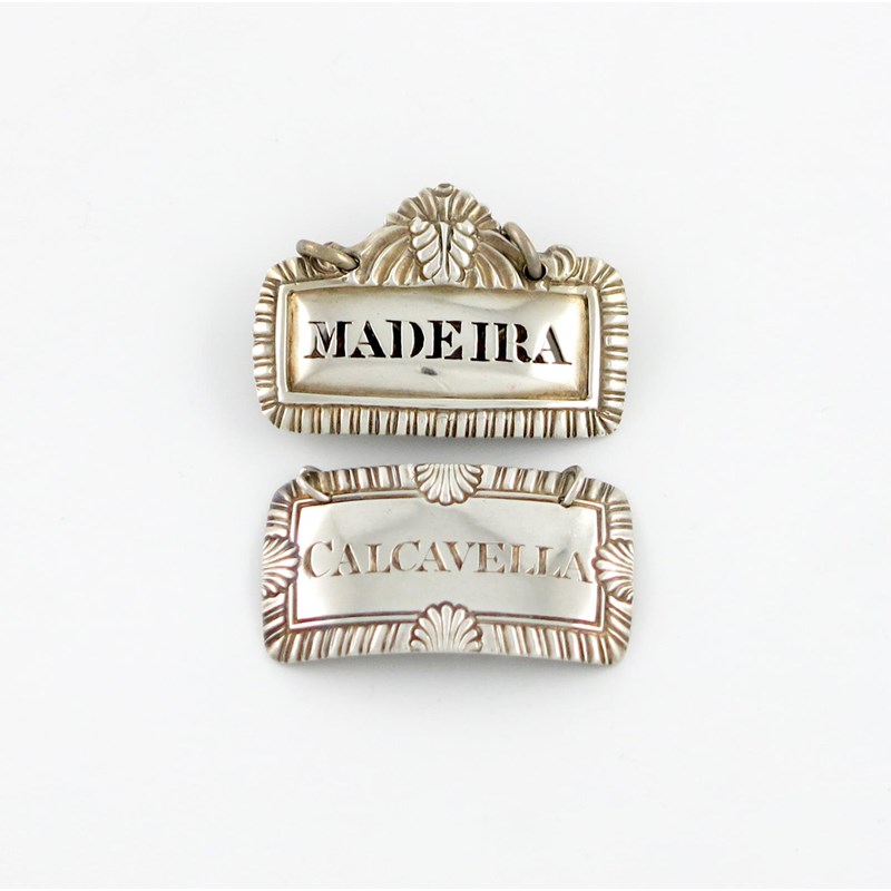 rectangular form, gadroon border, foliate pediment, incised 'MADEIRA', plus one by Joseph Willmore, incised 'CALCAVELLA', approx. weight 0.9oz. (2)