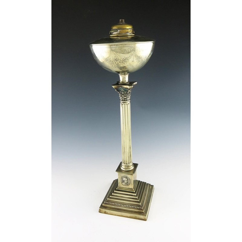 Corinthian column form, with a circular oil holder, engraved foliate decoration, on a stepped square base, height 54.5cm.