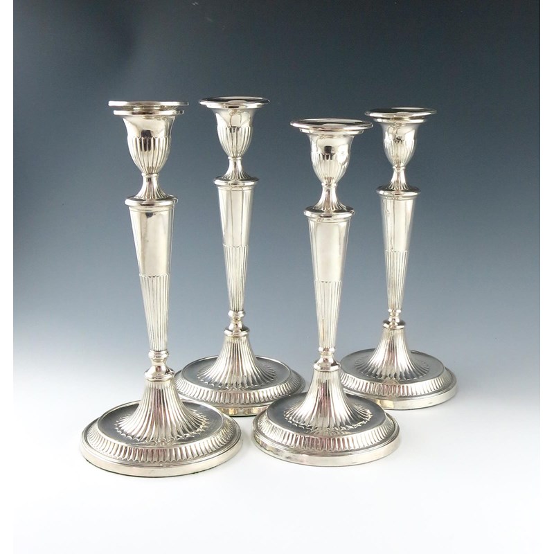 Two similar pairs of George III old Sheffield plated candlesticks,