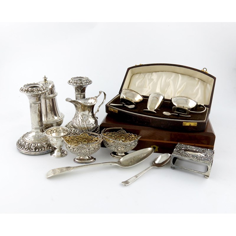 comprising: a pair of candlesticks, Birmingham 1906, a George III cream jug, London 1786, a sugar caster, a pair of small swing-handled baskets, a matchbox cover, a cased three-piece condiment set, two spoons and a cased set of six electroplated fruit knives and forks, and an electroplated egg cup, approx. weighable 18oz. (qty)