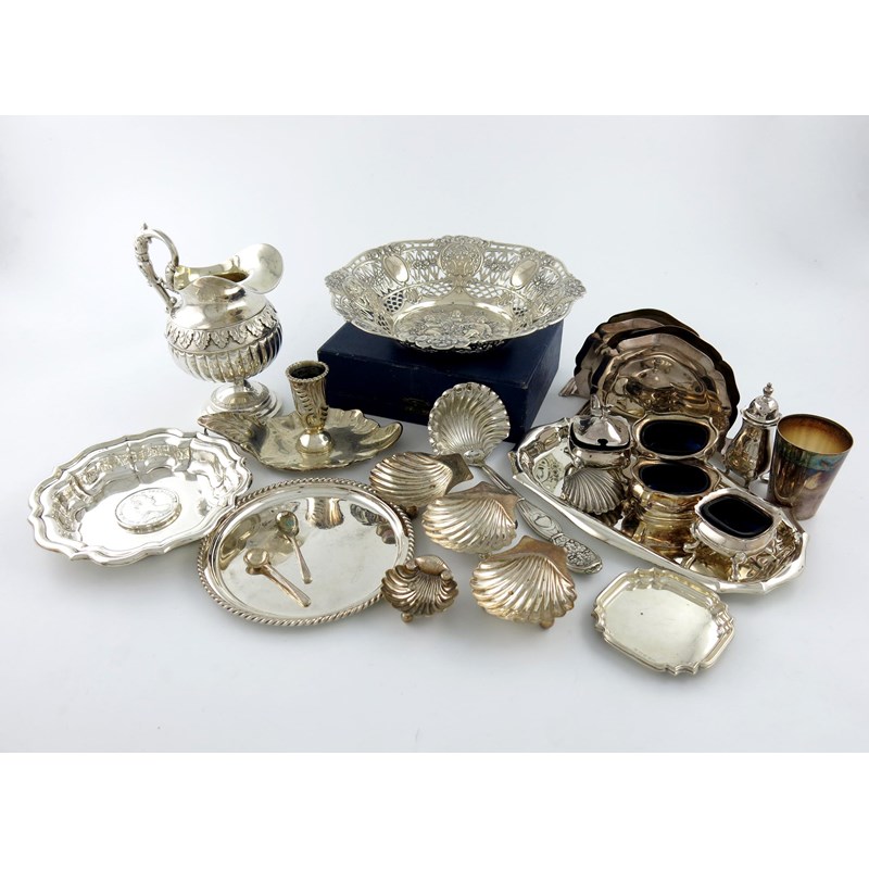 German, Austrian and English, comprising: a pierced basket with cherubs, a 19th century cream jug, a leaf shaped chamber stick, a cased set of twelve menu card holders, a ladle, two dishes, two ashtrays, a beaker, four shell dishes, and other items including some electroplated pieces, approx. weight 40oz. (qty)