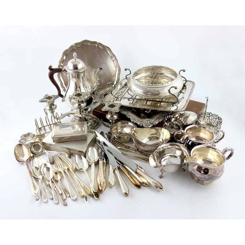 comprising silver items: a salver, by E. Viner, Sheffield 1964, two cigarette boxes, a sauce boat, a sugar bowl, and a quantity of electroplated items including a coffee set and flatware, approx. weighable 30oz. (qty)