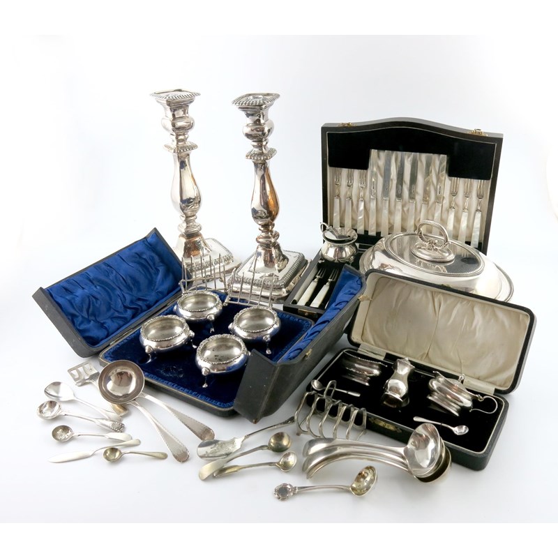 comprising silver items: a pair of Georgian sauce ladles, a cased set of four salt cellars, London 1901, a cased three-piece condiment set, a pair of toast racks, a mustard pot, five fruit knives, three fruit knives plus other items including a pair of old Sheffield plated candlesticks and an electroplated entrée dish and cover, approx. weighable 20oz. (qty)