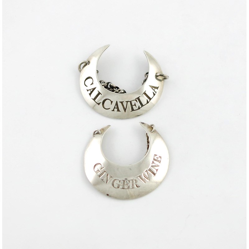 crescent form, incised 'GINGER WINE', and another George III silver wine label, by Peter and Ann Bateman, London 1794, crescent form, incised 'CALCAVELLA', approx. weight 0.4oz. (2)