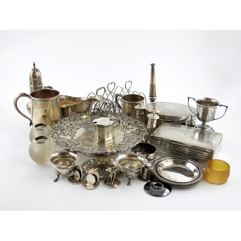 comprising: a pierced dish, by Edwards and Sons, Sheffield 1916, two silver mugs, an oval trinket box, two globe match strikers, a cigarette box, a sauce boat, a sugar caster, a set of three toast racks, four small dishes, a pair of menu card holders, three pepper pots, three salt cellars, a mustard pot, a trophy cup, and candlestick (a.f), and a napkin ring, approx. weighable 59oz. (qty)