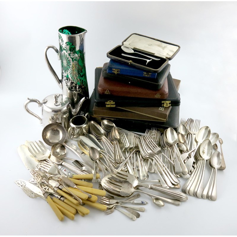 comprising silver items: a cased baby feeder set, a cake knife, six cased tea knives, a green overlay jug, plus electroplated items including a canteen of Rat-tail pattern, and other items. (qty)