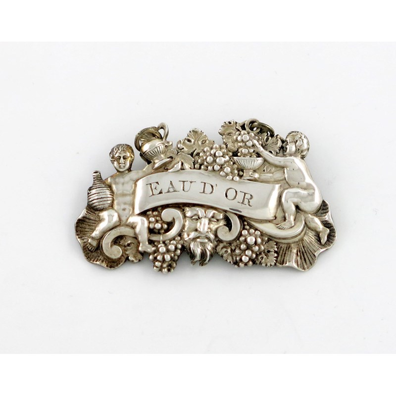 shaped oval form, embossed with Bacchanalian putti and grapevines, incised 'EAU D' OR', length 6cm, approx. weight 0.4oz.
