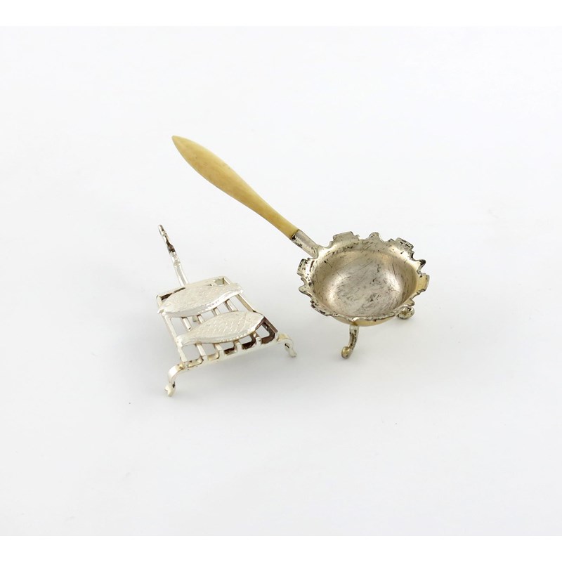 circular form, turned ivory handle, wavy-edge border, on three scroll feet, plus a 19th century miniature of two fish on a griddle, approx. weight 1oz. (2)