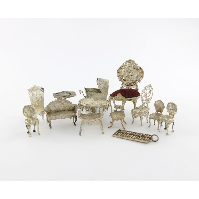 comprising: a chair with a velvet seat, Birmingham 1901, possibly for use as a pin cushion, plus a pram, a sofa, six chairs, a stool, two tables and an abacus, approx. weight 7oz. (13)