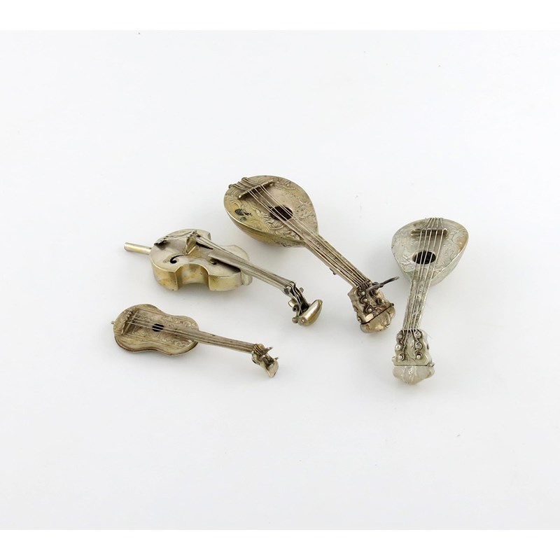 comprising: two mandolin scent flasks, embossed with figural and foliate scroll decoration, the hinged covers open to reveal a cork stopper, plus a guitar and a cello, approx. weight 7oz. (4)