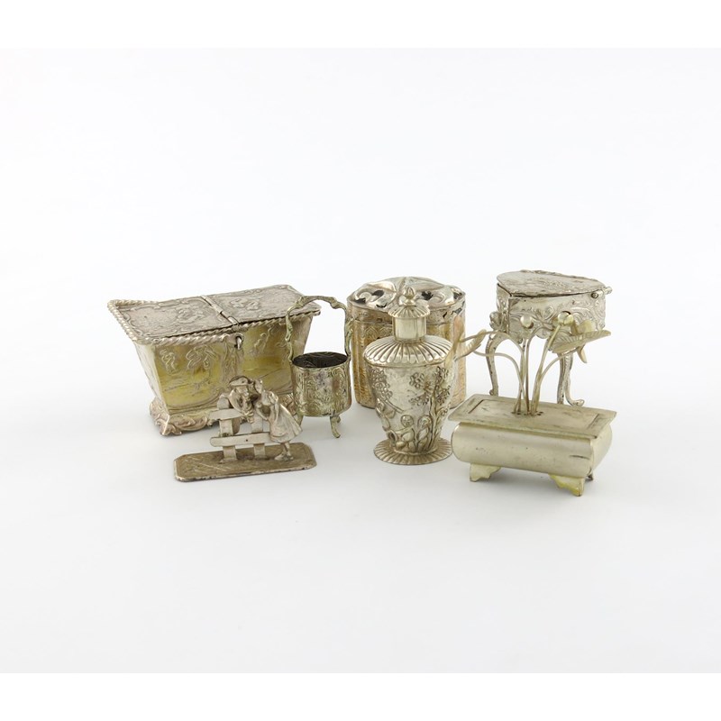 comprising: a heart shaped box, on three cabriole legs, with import marks for Sheffield 1896, a Dutch picnic basket with two hinged covers, a figural group, a tea canister, a Dutch confit box, a flower pot and a bucket, approx. weight 5oz. (7)