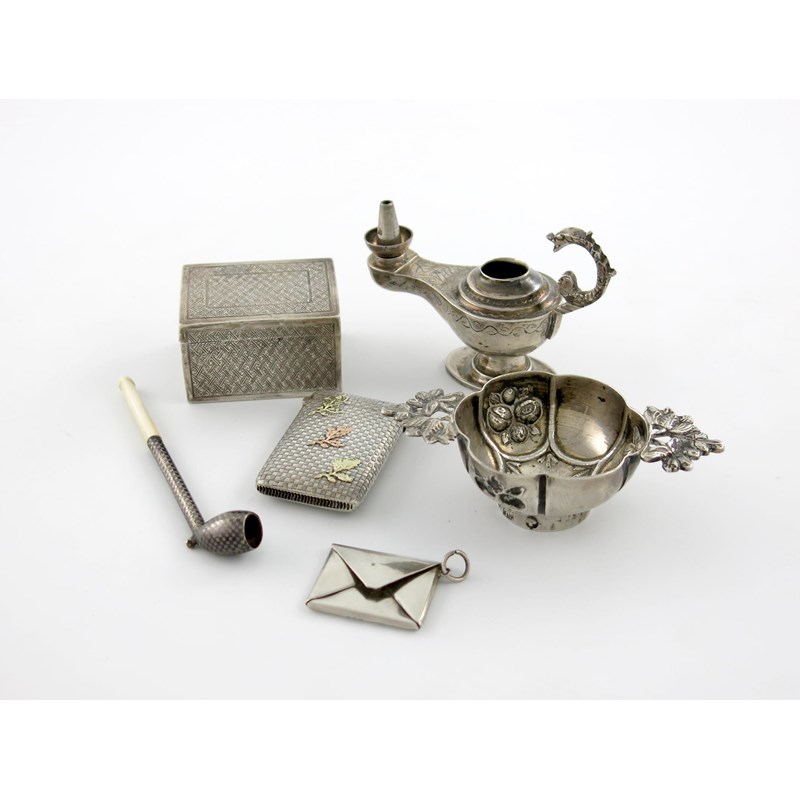comprising: a French vesta case, of rectangular form, basket-weave decoration, applied with oak leaves, a miniature oil lamp, a two-handled dish, a stamp case, a box, and a pipe. (6)