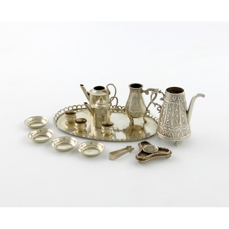 comprising: an oval tray with a pierced gallery, three coffee pots, (lacking covers), a smaller coffee pot, three tea bowls, four saucers, a pair of sugar tongs and a stand, approx. weight 3.5oz. (14)