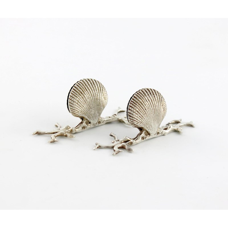 modelled as a scallop shell, on a coral base, length 8.5cm. approx. weight 2.5oz. (2)