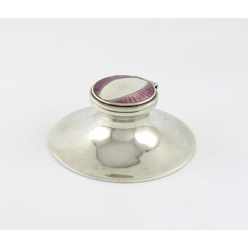 circular capstan form, the hinged cover with purple and white enamel decoration, diameter of base 12.5cm.