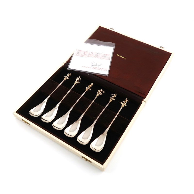 elongated bowls, with silver-gilt figural finials depicting six ancient Olympic sports, commemorating the 1976 Montreal Olympic games with a signed certificate, length 16cm, total approx. weight 5.2oz. (6)