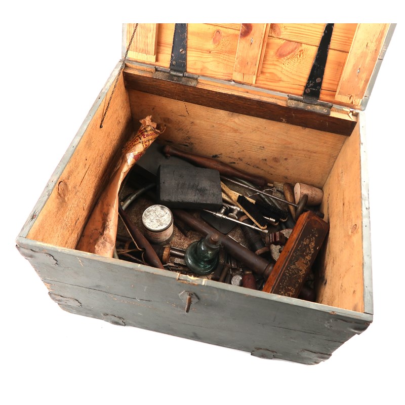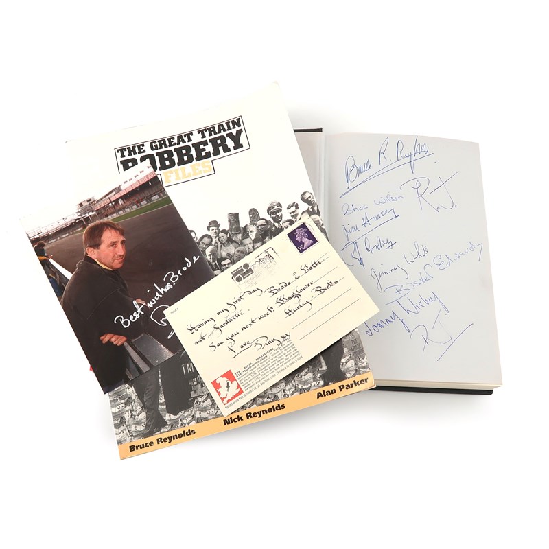 the bracelet of inter-linked chain form with a central Maltese cross inscribed 'Nil Desperandum', length 18cm, the cup and saucer of plain circular form, spot-hammered decoration, diameter of saucer 14.2cm, approx. total weight 8.5oz, together with an old wooden box containing some of Roy James' tools, plus a book 'The Train Robbers', the inside cover signed by some of the Great Train robbers, another book 'The Great Train Robbery Files', a signed photograph and postcard.