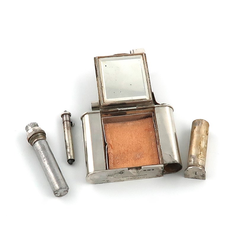 rectangular form, a hinged front opens to reveal the mirror and powder compartment, the base with a pull-out lipstick, the lighter cover opens to reveal a scent flask, the bar with a pull-out pencil, repaired with glue, which has dried out and is loose, height 6cm.
