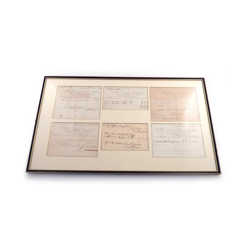 A collection of six framed late 18th and early 19th century receipts relating to silver